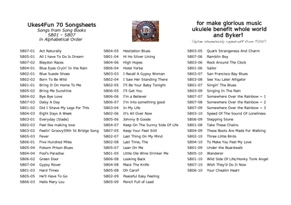 As with Songbook 8, I am trying to share out the uke-lurve by including as many different singers as possible in each song book. Apologies to those who have not yet been included in Songbooks 8 or 9 – your time will come as soon as you have sent or approved the song files.